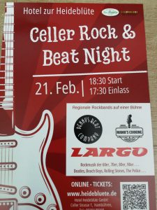 Im Hotel „Zur Heideblüte“ in Hambühren stand am Samstag, 21. Februar 2026, wieder die Celler Rock- und Beatnight auf dem Programm. Drei Bands sorgten dabei für einen abwechslungsreichen Abend: „Denny’s Beat-Company“ eröffnete mit Musik aus den 60er bis 90er Jahren, anschließend brachte „Mama’s Cooking“ Rock-Klassiker und Americana auf die Bühne. Den Abschluss übernahm die Hambührener Band „Fargo“, für die der Auftritt zugleich ein Heimspiel war.